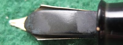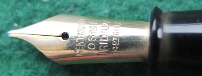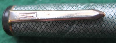 Here is a very nice button-fill fountain pen in green lizard-skin finish with gold-plated trim. The pen has a medium grade 14ct gold Mentmore nib; there is no sign of wear on the barrel where the cap posts but just a feint sign where the cap fits however, there is no other damage. The plating on the band is good but the edges of the clip show signs of wear; the imprint is readable.