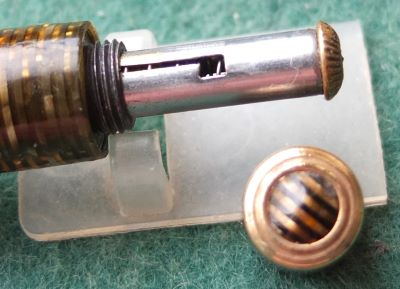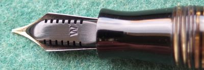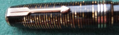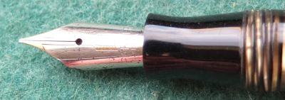 A very nice condition Major-size Vacumatic fountain pen in golden pearl that has a steel lock-away filler; there is a little plating wear on the bands and just a little on the high points of the tassie ring and the clip. There are no cracks or splits and virtually no scratches either; both the blind cap tassie and the clip tassie is golden striped. The pen has been stripped, cleaned, had a new diaphragm fitted, reassembled, adjusted, and write tested. The nib is a fine grade two-colour 14ct gold, and I would think, original to the pen; it writes nicely. The imprint is barely readable.