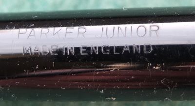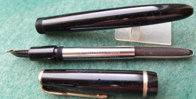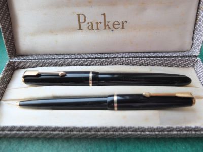 Here is a very nice Duofold Junior fountain pen and ballpen set in black from the 1960s with a crisp imprint; this pen has been used so has a few small marks consistent with that use but it is not damaged and any new owner, wanting it to use, will be thrilled with it; it has a lovely medium grade 14ct gold nib and writes nicely; the pen set has obviously been well looked after, albeit used, but there are no signs of plating wear on the bands or the clips; there are no signs of wear where the cap fits nor where it is posted. Please note the pen set is boxed but its a bit 'dog-eared.