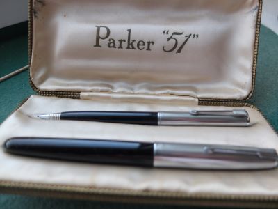 This is a very nice 51 fountain pen and pencil set in their original box; the pen set is in good used condition but still in good working order; the nib is a medium grade 14ct gold and writes nicely. The pencil has spare leads and a new eraser; the set is boxed and it is probably the original.