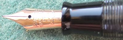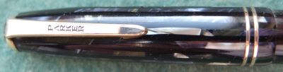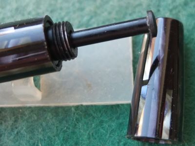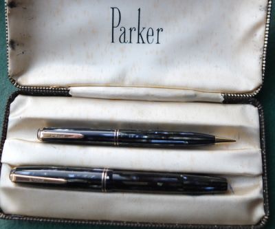A very nice condition Junior Duovac fountain pen and pencil set in blue, silver and black with gold-plated trim; the pen has a vacumatic style plastic pump; there is virtually no plating wear on the bands, the nozzle, or the clips. There are no cracks or splits and virtually no scratches either. The pen has been stripped, cleaned, had a new diaphragm fitted, reassembled, adjusted, and write tested. The nib is a fine grade 14ct gold, and I would think, original to the pen; it writes nicely. The imprint is very readable and the set is boxed but I not sure its the original.