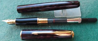 A very nice condition, even mint, Sonnet fountain pen in laque firedance that is a cartridge or converter filler with a converter fitted; the pen has gold-plated trim. There are no cracks or splits and no scratches either; the nib is a fabulous broad oblique grade 18ct gold and will write like a dream.