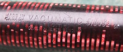 A very nice condition Major-size Vacumatic fountain pen in burgundy pearl that has a steel lock-away filler and gold-plated trim; there is little or no plating wear on the bands, the tassie ring, or the clip. There are no cracks or splits and virtually no scratches either; the blind cap tassie is burgundy stripey and the clip tassie is black. The pen has been stripped, cleaned, had a new diaphragm fitted, reassembled, adjusted, and write tested. The nib is a fine grade single-colour 14ct gold, and I would think, original to the pen; it writes nicely. The imprint is very readable and better than it looks in the picture. Please note this imprint has 'Reg Tm, Other Patents Pending' which I feel is unusual.