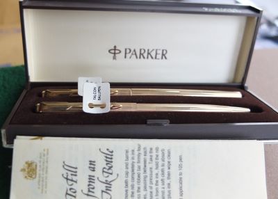 Here we have a mint unused gold-plated Parker Falcon fountain pen and ballpen set in superb condition; the pen has a medium grade nib and is a cartridge or converter filler and has a converter fitted; the pens have not been used so are in such lovely condition; there are no cracks, splits or scratches and the clips are firm. The set is boxed and the box is mint along with its leaflet.