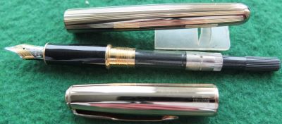 Here we have a mint but inked immaculate-condition French-made Parker Sonnet fountain pen in gold-filled finish with gold-filled trim; the fountain pen is a cartridge or converter-fill pen and has a converter fitted; the pen has a broad oblique grade 18ct gold nib; the pen has not been used so is in immaculate condition; there are no cracks, splits or scratches and the clip is firm.