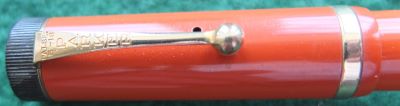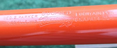 Here is a very nice Duofold Senior Lucky Curve fountain pen in red permanite from 1926 ish with a very crisp imprint; this pen has been used so has a few small marks consistent with that use but it is not damaged and any new owner, wanting it to use, will be thrilled with it; it has a lovely medium grade 14ct gold nib and writes nicely; the pen has obviously been well looked after, albeit used, but there are no signs of plating wear on the band or the clip; there are very slight signs of wear where the cap fits but not where it is posted.