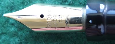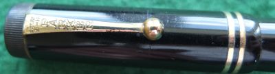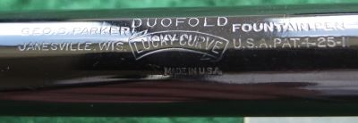 Here is a very nice Duofold Senior Lucky Curve fountain pen in black permanite from 1928 ish with a very crisp imprint; this pen has been used so has a few small marks consistent with that use but it is not damaged and any new owner, wanting it to use, will be thrilled with it; it has a lovely fine grade 14ct gold nib and writes nicely; the pen has obviously been well looked after, albeit used, but there are no signs of plating wear on the bands or the clip; there are very slight signs of wear where the cap fits but not where it is posted. Please note that despite what the picture seems to show there are no cracks or blemishes on the nib.