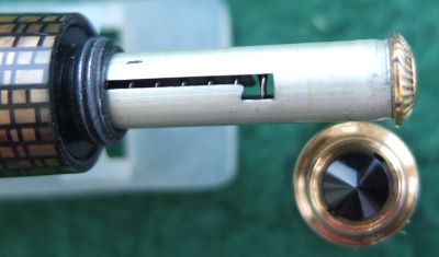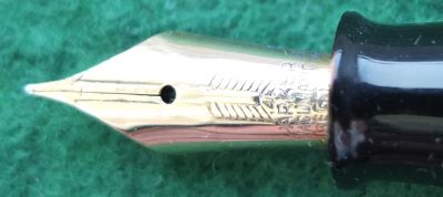 A beautiful condition Golden Web Vacumatic fountain pen that has an aluminium lock-away filler; there is no plating wear on the bands or the tassie ring but there is a little 'spotting' on the clip. There are no cracks or splits and virtually no scratches either; the blind cap and the clip tassies are both black. The pen has been stripped, cleaned, had a new diaphragm fitted, reassembled, adjusted, and write tested. The nib is a fine grade single-colour 14ct gold, and I would think, original to the pen; it writes nicely with just a little flexibility. The imprint is barely readable.