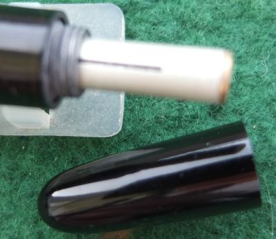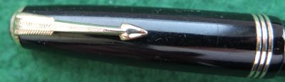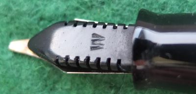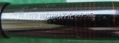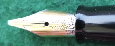 A beautiful condition Debutante-size Vacumatic fountain pen in black that has an aluminium speedline filler; there is no plating wear on the bands or the clip. There are no cracks or splits but there are a few scratches consisted with its age; the clip tassie is black. The pen has been stripped, cleaned, had a new diaphragm fitted, reassembled, adjusted, and write tested. The nib is a broad grade 14ct gold, and I would think, original to the pen; it writes nicely with good flexibility. The imprint is crisp. This is a really lovely pen.