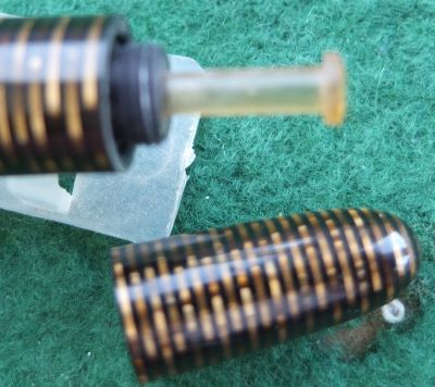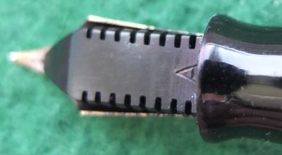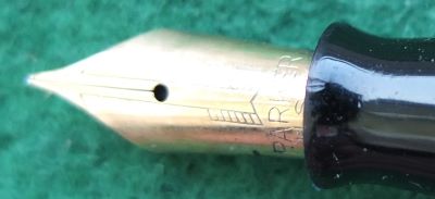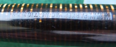 A very nice condition standard-size Vacumatic fountain pen in golden pearl that has a plastic filler and gold-plated trim; there is a little plating wear on the bands and on the clip. There are no cracks or splits but just a few fine scratches; the clip tassie is black. The pen has been stripped, cleaned, had a new diaphragm fitted, reassembled, adjusted, and write tested. The nib is a fine grade single-colour 14ct gold, and I would think, original to the pen; it writes nicely. The imprint is very readable.
