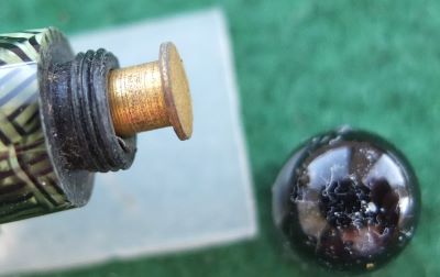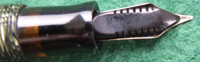Here is a very nice Canadian Televisor in green and black from 1935 ish with gold plated trim and a very readable imprint; this pen has been used so has a few small marks consistent with that use but it is not damaged and any new owner, wanting it to use, will be thrilled with it; it has a lovely medium grade 14ct gold Canadian nib and writes nicely; there are slight signs of plating wear on the bands but not on the clip; there are very little signs of wear where the cap fits or where it is posted. Please note this is the larger version. Please note the marks on the top of the blind cap are dust.