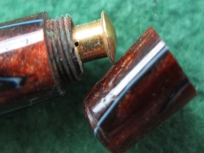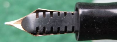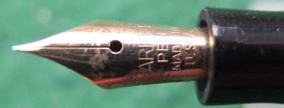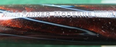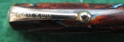Here is a very nice Canadian Moderne in browns and blue from 1940 ish with a very readable imprint; this pen is a button-filler and has been used so has a few small marks consistent with that use but it is not damaged and any new owner, wanting it to use, will be thrilled with it; it has a lovely extra-fine grade 14ct gold nib and writes nicely; there are no signs of plating wear on the clip or on the band; there are slight signs of wear where the cap fits but not where it is posted.