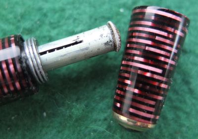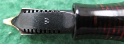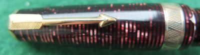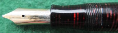 A very nice condition Maxima Vacumatic fountain pen in burgundy pearl that has an aluminium speedline filler and gold-plated trim; there is virtually no plating wear on the band, the tassie ring, or the clip. There are no cracks or splits and virtually no scratches either; the blind cap tassie is butgundy striped whilst the clip tassie is black. The pen has been stripped, cleaned, had a new diaphragm fitted, reassembled, adjusted, and write tested. The nib is a fabulous medium grade two-colour 14ct gold, and I would think, original to the pen; it writes like a dream. The imprint is mostly readable. Please note the picture of the back of the nib makes it look broader than it is.
