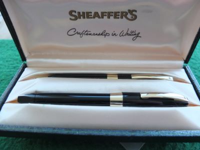 A Sheaffer PFM (PFM meaning Pen for Men) is a little larger than the average pen but still not too large for a ladies hand and I know a few ladies that use one as an everyday pen; it uses the unusual snorkel filling system which is generally found to be quite a talking point; these pens were made in 1959 in five colours viz. black, burgundy, blue, green, and grey and in five models viz. PFM I, PFM II, PFM III, PFM IV, and PFM V; this pen set is the black one with the gold electro-plated trim.