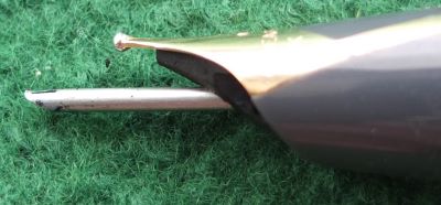 This is another green PFM V pen in perfect mechanical condition but has been used so there are fine surface scratches visible under a glass however, it is in beautiful condition; this cap and barrel are both good with no plating wear to the cap and trim, one small mark on the cap as shown in the last picture, and only small dents to the cap top; the clip is secure but the head of the white button is missing. The nib is a lovely broad grade 14k gold and writes nicely.