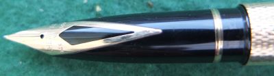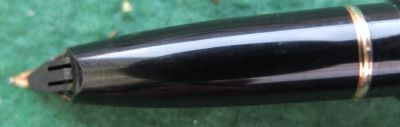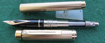 This is an almost mint but inked Targa fountain pen that has been inked but not used; the surfaces are very good and there are no cracks, splits or dings; the clip is secure. The nib is a fine grade 14ct gold and marked USA; the pen will take cartridges or a converter which is in fact fitted.