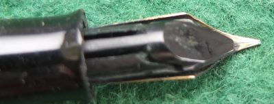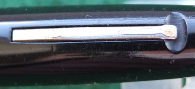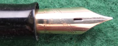 A very nice Wahl Eversharp Skyline in black with a green and black striped cap; the pen is a lever-filler and has a fine grade 14ct gold nib.