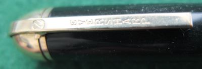 A very nice Wahl Eversharp Skyline in dark green and has a gold-plated crown at the top of the cap; the pen is a lever-filler and has a fine grade 14ct gold nib. The crown, clip and band are all good but the lever has some plating wear.