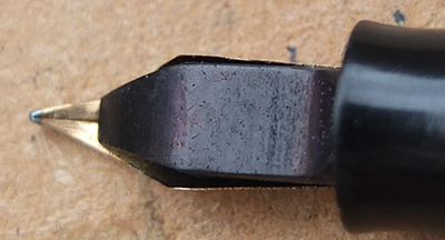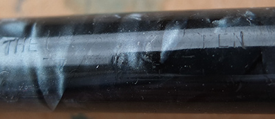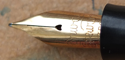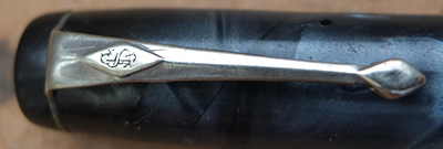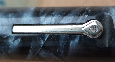 Here is a nice condition CS479 (I think) in blue marbled finish with nickel plated trim, made around 1940; the pen is a lever-filler and has a fine grade 14ct gold nib and writes nicely; there is no plating wear on the clip or the lever; there are no cracks, chips or deep scratches and the imprint is hardly readable.