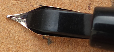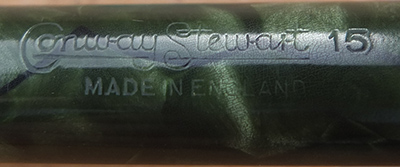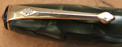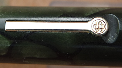 Here is a very nice condition CS15 in green and black, made around 1950; the pen is a lever-filler and has a fine grade 14ct gold nib and writes nicely; there is little or no plating wear on the band, the clip or the lever; there are no cracks, chips or deep scratches and the imprint is crisp.