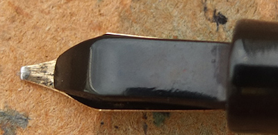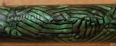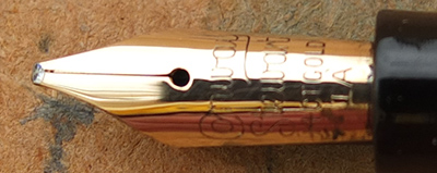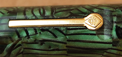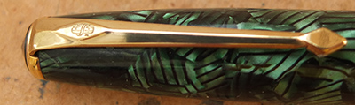 Here is a very nice condition CS73 in green hatched finish, made around 1950; the pen is a lever-filler and has a broad grade 14ct gold nib and writes nicely; there is no plating wear on the bands, the clip or the lever and, surprisingly, there is only a tiny bit of pitting on one edge of the lever; there are no cracks, chips or deep scratches and the imprint is very readable.