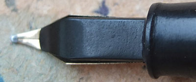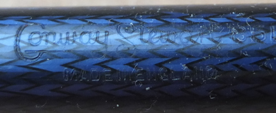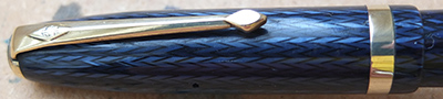 Here is a nice condition CS85L fountain pen in blue herringbone, made around 1955; the pen is a lever-filler and has a medium grade 14ct gold nib and writes nicely; there is no plating wear on the clip and the lever, but there is a little on the edges of the band; there are no cracks, chips or deep scratches and the imprint is readable; this is a nice pen, big too.