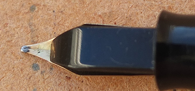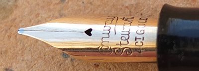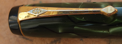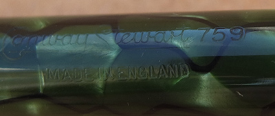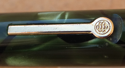 Here is a nice condition CS759 Conway Stewart in green and black marbled finish with gold plated trim, made around 1948; the pen is a lever-filler and has a medium grade 14ct gold nib and writes nicely; there is no plating wear on the clip or the lever but just a little on the edges of the band; there are no cracks, chips or deep scratches and the imprint is very readable.