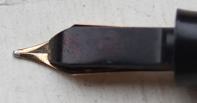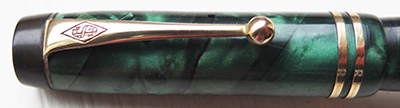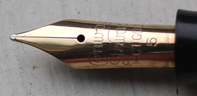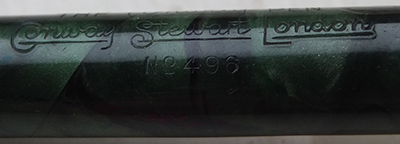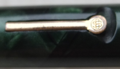 Here is a very nice condition CS496, made around 1940, in green and black with gold-filled trim; the pen is a lever-filler and has a medium grade 14ct gold No.5 nib and writes nicely; there is little or no plating wear on the band or the clip but a little on the edges of the lever; there are no cracks, chips or deep scratches and the imprint is crisp. Unusually there is no 'waisting' on the cap.