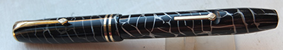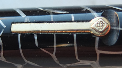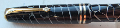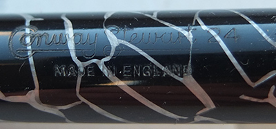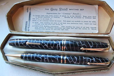 Here is a very nice condition CS24 fountain pen and pencil set in cracked ice, made around 1950; the pen is a lever-filler and has a medium grade 14ct gold nib; it writes nicely; there is no plating wear on the bands but there is a little on the high points of the clips, and there is a little pitting on the edges of the lever; there are no cracks, chips or deep scratches and the imprints are readable; this is a nice pen set and quite hard to find. The set is boxed but its a bit tatty.