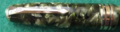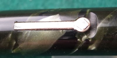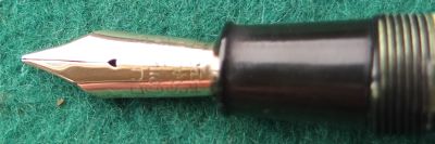 Here is a very nice condition CS58 in green and black marbled finish, made around 1950; the pen is a lever-filler and has a medium grade 14ct gold nib and writes nicely; there is no plating wear on the bands but the clip has just a little on the high points whilst there is just a little pitting on the edges of the lever; there are no cracks, chips or deep scratches and the imprint is readable.
