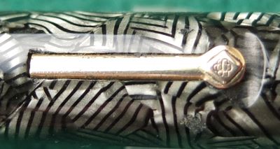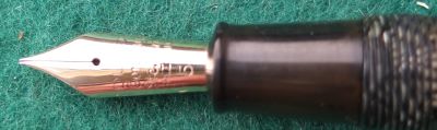 Here is a very nice condition CS58 in green and black lined finish, made around 1950; the pen is a lever-filler and has a medium grade 14ct gold nib and writes nicely; there is no plating wear on the bands but the clip has just a little on the high points whilst there is just a little pitting on the edges of the lever; there are no cracks, chips or deep scratches and the imprint is readable.