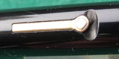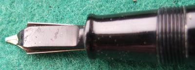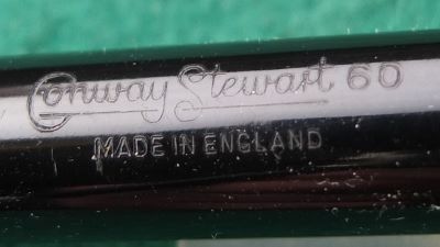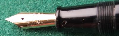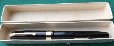 Here is a very nice immaculate condition CS60 in black, made around 1950; the pen is a lever-filler and has a broadish medium grade 14ct gold Duro nib and writes nicely; there is a no plating wear on the band, the lever, or the clip; there are no cracks, chips or deep scratches and the imprint is very readable. A lovely pen and big too.
