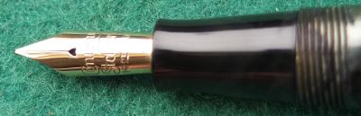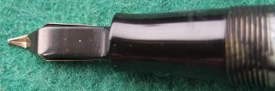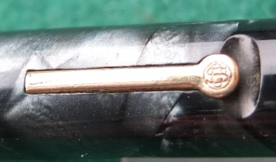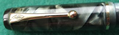 Here is a very nice condition CS476 in blue and black marble, made around 1940; the pen is a lever-filler and has a fine grade 14ct gold nib and writes nicely; there is a little plating wear on the band, the high points of the clip, and on the edges of the lever; there are no cracks, chips or deep scratches and the imprint is readable.