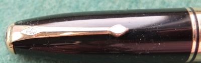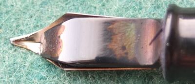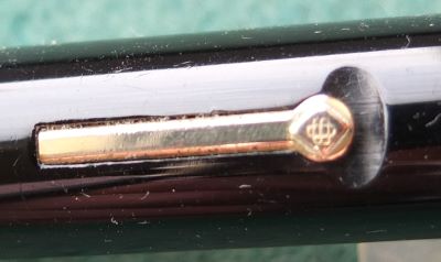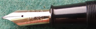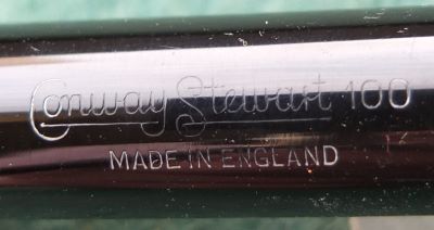 Here is a very nice condition CS100 in black, made around 1950; the pen is a lever-filler and has a good medium grade 14ct gold Duro nib and writes nicely with a element of flex; there is a no plating wear on the bands or the lever but there is just a little on the high points of the clip; there are no cracks, chips or deep scratches and the imprint is readable. A lovely pen and big too. Please note the nib picture looks as if the nib tines are out of alignment but they are not.