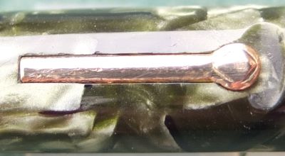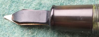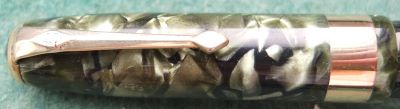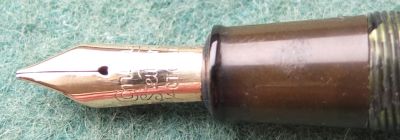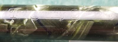 Here is a very nice condition CS27 in green and black marbled finish, made around 1950; the pen is a lever-filler and has a medium grade 14ct gold nib and writes nicely; there is a little plating wear on the edge of the band and on the high points of the clip but there is wear on the lever; there are no cracks, chips or deep scratches and the imprint is readable but thin.