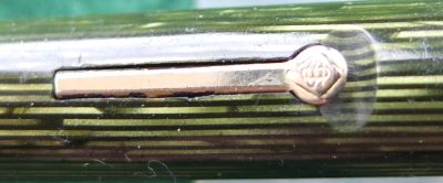 Here is a very nice condition CS36 fountain pen in green lined, made around 1950; the pen is a lever-filler and has a broadish medium grade 14ct gold nib; it writes nicely; there is no plating wear; there are no cracks, chips or deep scratches and the imprint is crisp; this is a beautiful pen and quite hard to find in this condition.