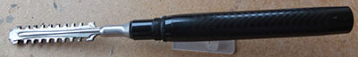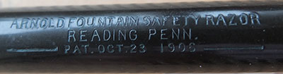 Here we have an unusual, I think, and quite rare Arnold Fountain Safety Razor in black hard rubber; it was made around 1910; they made them between 1906 and 1920. It looks like an oversize fountain pen but is a razor for the travelling man. The cap unscrews and then the front end of the barrel unscrews and reversed and screwed back in to form a razor; this one needs a new blade; the item is in good condition.