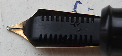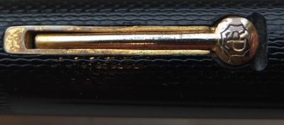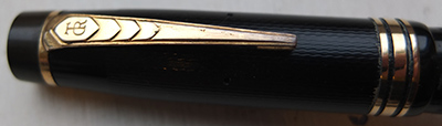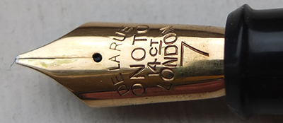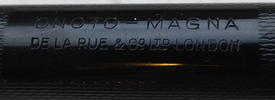 Here we have a very nice condition Onoto Magna lever-fill fountain pen, made around 1947, with a black chased finish; the pen is in very good condition with a few tiny marks but generally its very good; the plating on the lever box and the end of the clip have a little wear; the pen is a lever-filler and has a broadish medium grade 14ct gold single-colour No.7 nib which writes beautifully with a bit of flexibility.