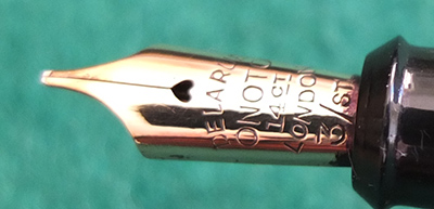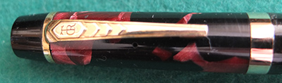 Here we have a mechanically-sound lightly-worn condition 6234 fountain pen, made around 1938, in red and black marbled finish; the pen has a few tiny marks but generally its very good; the pen is a piston-filler and has a medium grade 14ct gold No.3/st nib which writes nicely. This is a beautiful pen with little or no plating wear and a good imprint however, there are a few scratches on the cap band and a few spots below the band; I have checked thoroughly and there has not been a crack repair covered up.