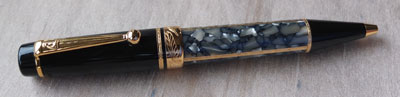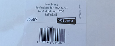 oeu260: Here is new-old-stock unused unopened sealed Montblanc Model No.36689 Soulmakers-for-100-Years Limited-Edition Rollerball; it is numbered 0038 of a limited edition of 1906 pens. The cap is crowned by a large 43 facet diamond, cut in the form of the Montblanc signet. The granite cap is carved from a boulder hewn from the Mont Blanc massif, combined with a 925 Sterling Silver barrel; the pictures show the end of the box and a copy-picture of the pen from a MB catalogue. £1450.00 |