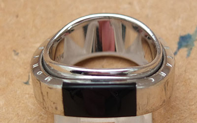 oeu241: A Mont Blanc 925 silver ring with a black inset; it has been worn and shows some signs of use; it comprises two concentric rings where the outer ring is free to rotate around the inner one. £70.00 |