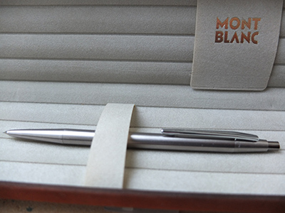 oeu261: A Mont Blanc ballpoint pen in 925 silver with 925 silver trim and in lovely condition; the pen has been used but not a lot, I would think, and dates from the 1990s; it writes nicely! £325.00 |