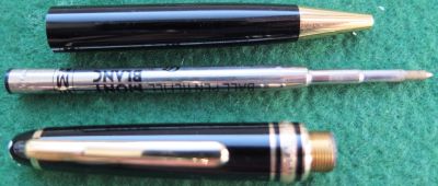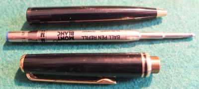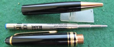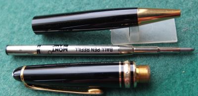 oeu294: A carefully used Mont Blanc ballpoint pen in black with gold-plated trim; this pen is in lovely condition but doesn't come with its box. It is genuine as are all the other MB pens on my site. £90.00 SOLD