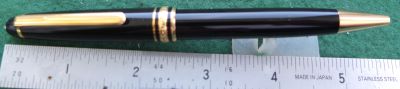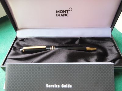 oeu297: A used Mont Blanc ballpoint pen in black with gold-plated trim; this pen is in lovely condition, albeit it has a few scratches, and boxed too. It is genuine as are all the other MB pens on my site but it doesn't have a serial number. £120.00 |