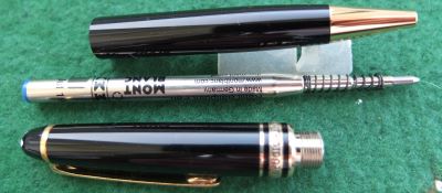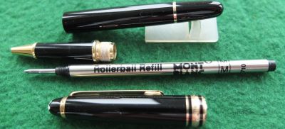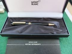 oeu291: A carefully used Mont Blanc rollerball pen in black with gold-plated trim; this pen has a serial number and comes in its original box; it is in lovely condition with a new refill. £145.00 SOLD |