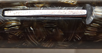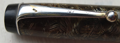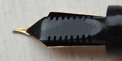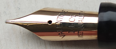 Here is a very nice lever-fill fountain pen in green and silver with gold-plated trim. The pen has a fine grade 14ct gold Valentine nib; there is no sign of wear on the barrel where the cap posts but just a feint sign where the cap fits however, there is no other damage. The plating on the lever and the clip is poor but the cap band is good; the clip has a worn 'V' just about visible and the imprint is readable.