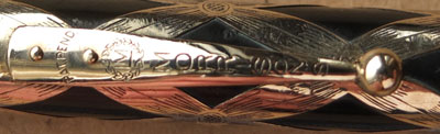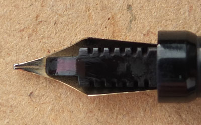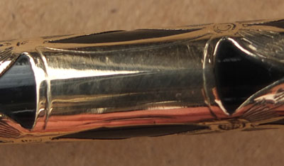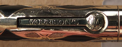 Here is a very nice, almost mint, Morrison's lever-fill fountain pen in black with a 1/40th 14kt gold filigree overlay; the pen has not had a lot of use from looking at its condition and the gold plating is very good; the pen has a 14ct gold fine grade nib. The cartouche is blank.
