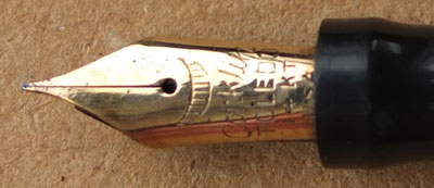 Here is a very nice, nay beautiful, Conklin crescent-fill fountain pen in black with gold plated filigree overlay and trim; the pen has not had a lot of use from looking at its condition and the gold plating is good apart from a few spots of plating wear; the pen has a 14ct gold fine grade Conklin Toledo nib.