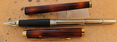Here we have a lightly-used condition Parker 180 cartridge or converter-fill fountain pen in tortoiseshell finish with gold-filled trim; the pen has an extra-fine/medium grade nib; the pen has been used and is in lovely functional condition as there are no cracks, splits or serious scratches and the clip is firm BUT there are a few spots where the laque has been lost and the clip is spotted with marks.