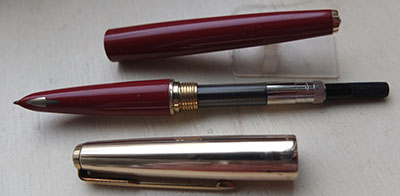 Here we have a very nice Parker 61 fountain pen in rouge red with a gold filled cap; the pen is from the mid 1960s and has been used but still has years of life left in it; there are no marks on the barrel or on the cap; the pen has a medium grade 14ct gold nib; the pen is a cartridge or converter-filler with a converter fitted; please bear in mind that this was a capillary-fill pen but has been converted. This pen writes nicely.